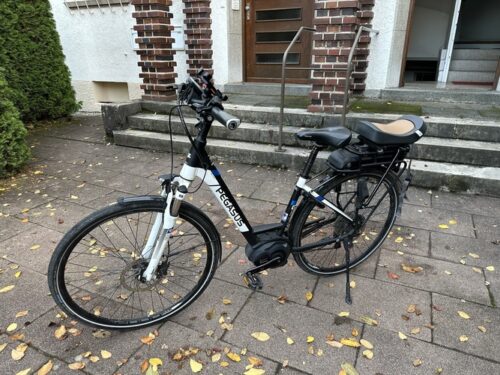 Pegasus, E10 Touren Rad mit dem starken Bosch CX Motor. Es ist ein Kindersitz für Kinder ab vier Jahren montiert.